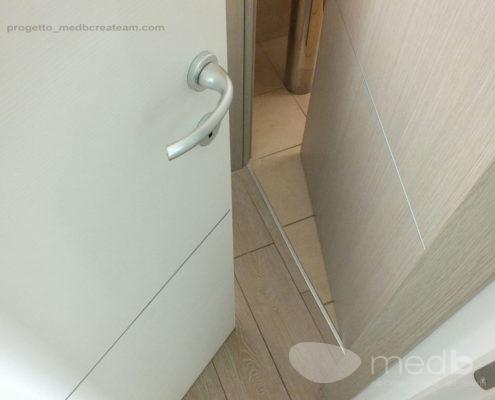 Un divisorio in pietra naturale scaglia bianca, all’ingresso, accoglie l’unico pilastro, il quadro elettrico ed un mobile svuota tasche, e funge da disimpegno e delimitazione dell’area pranzo, quest’ultima è contraddistinta concettualmente dall’area giorno con due pavimentazioni diverse , gres porcellanato effetto legno chiaro e antracite.