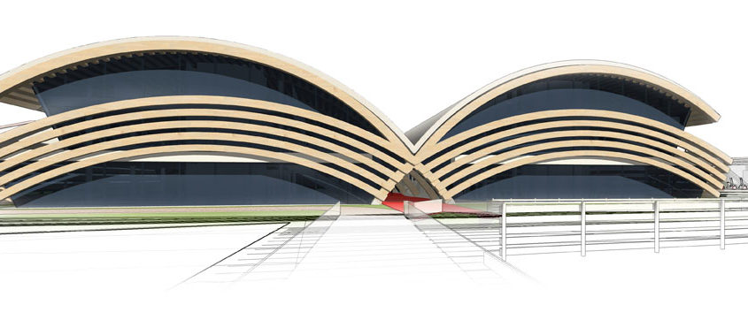 The entrance is a red bookmark that pass through all the building delimited by waving glass wall, that outline the Library to a side and the Expositive Area to the other.