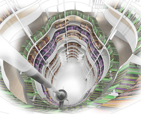 The library’s heart is a succession of irregular rings that pass through all the overlying layers, forming something similar to a cave, like a mine, where the precious gems are the books.
